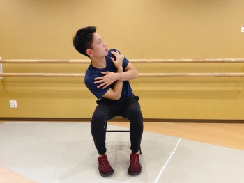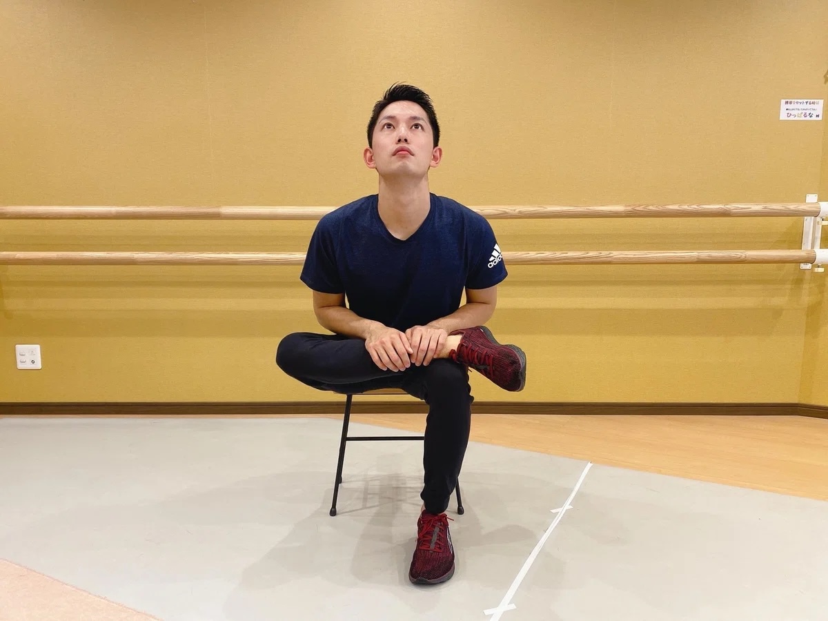 (座って斜め上体振り子体操+あぐらストレッチ体操)を交互に3周+足首コロコロ体操を1周を3〜5周行います。第1〜5腰椎は、第1〜5頸椎の動きと連動していますから、筋肉の少ない首に対してアプローチするより、大きな筋肉のある腰に対してアプローチする方が安全に運動効果を導き出せます。