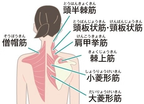 首には血管・気管・神経など、大切な器官が集中していますが、首後部には頭板状筋・頸板状筋・頭棘筋と筋肉が少なく、重い頭を支えるために首の骨は前方に向かって湾曲(横から見るとS字カーブ)しています。この形が、スイカ約1個分もある頭の重みをうまく分散しているのです。上肢(肩甲帯・腕・手)は首周辺の筋肉からぶら下がっていますので、直接首や肩周囲の筋肉の負担にもなっています。